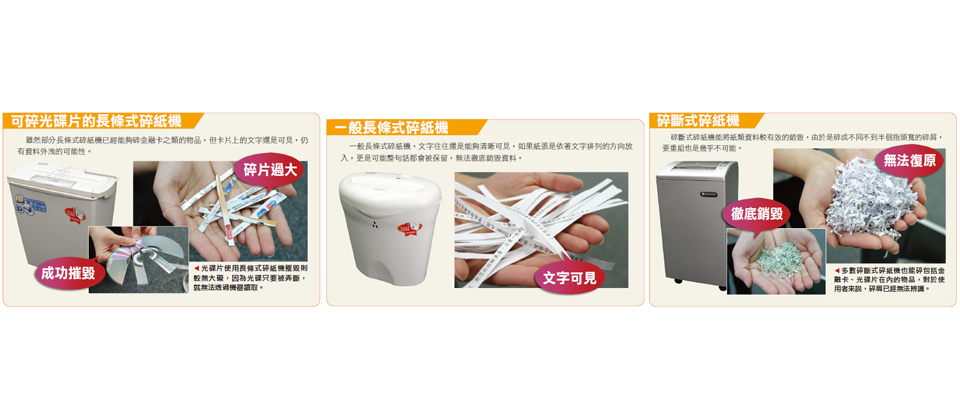 而為了確認碎紙機是否能夠徹底的銷毀紙類資料,我們實驗了3臺由震旦集團所提供不同類型的碎紙機,測試其碎紙和不同材質物品的能力。值得注意的是,不同的長條式碎紙機,碎出來的長條碎紙也有寬度的不同。此外,如果碎紙時,依照文字排列的方向放入長條式碎紙機,結果就很有可能會是整行的字依然清晰可見,無法達成資料銷毀的效果。即便是不依照文字排列的方向放入長條式碎紙機,把長條式碎紙拼拼湊湊整出一整份完整文件的可能性也存在著,遠不能達成資料完全銷毀的目的。至於其它物品,例如光碟片,長條式和碎斷式都能達到完全銷毀的效果。但像是金融卡之類的物品,長條式依然會出現文字無法完全碎去的缺點,有可能會保留卡號等資訊。
