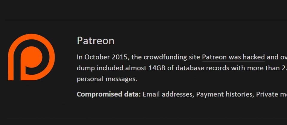 擁有微軟最有價值專家(Microsoft Most Valuable Professional,Microsoft MVP)頭銜的獨立安全研究人員Troy Hunt在他自己所設立的haveibeenpwned網站上表示,音樂眾籌網站Patreon已遭駭客入侵,並有超過16GB的資料在網路上流竄。Patreon也已證實此事。