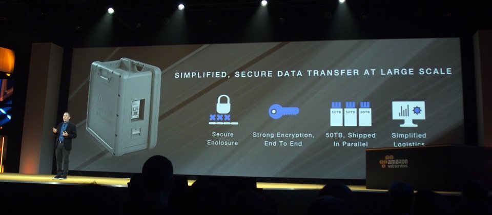在Amazon第四屆re:Invent大會上最引人注目的一項新產品,不是虛擬的雲端服務,反而是AWS新推出的超大量資料運送箱SnowBall。AWS提供了一個實體運送資料用的外接儲存箱,可用來儲存50TB到儲存使用者的資料,最多可串接10箱來運送500TB資料,再透過UPS等快遞服務將這批箱子個別送到AWS資料中心上傳。AWS表示,透過SnowBall箱運送,就算有1PB資料,只要1周就能運送到雲端S3儲存空間上,遠快於過去光是100TB資料,透過100MB網路傳輸就得花3個月。租用1箱SnowBall的費用,不含運費是200美元。