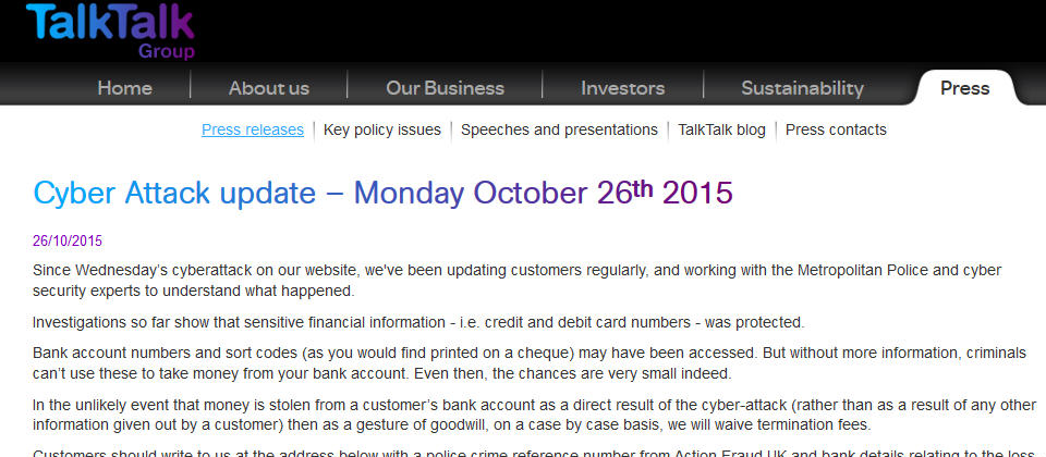 在英國提供付費電視、寬頻服務以及行動網路服務的電信業者TalkTalk日前傳出遭到大規模的駭客攻擊行動,恐造成400萬名客戶資料外洩,而此一數字幾乎等同於TalkTalk的總用戶數,而這已是TalkTalk今年第3起造成客戶資料外洩的網路駭客事件。(詳全文)