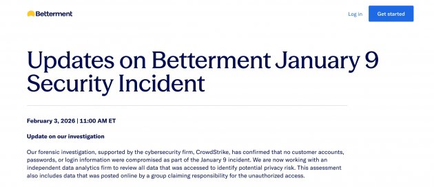 Betterment遭社交工程入侵取得存取權後,攻擊者透過第三方平臺發送加密貨幣詐騙訊息,2月3日鑑識稱帳戶與密碼未遭入侵,HIBP分析外流含約140萬個Email地址、姓名與地理位置