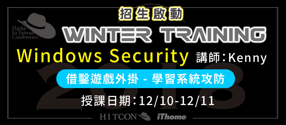 12/10-12/11借鑿遊戲外掛 - 學習系統攻防線上報名iThome研討會台北市從零開始一步步的學習系統底層知識與駭客記憶體攻擊手法,期望能培養出讓學員有獨立逆向分析 & 撰寫底層攻防程式的能力。 台灣駭客協會 Hacks in Taiwan Association | CHROOT Security Group | iThome 電週文化事業股份有限公司