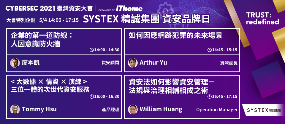 5 月 5 日 星期三 14:00-17:15 精誠集團 資安品牌日|CYBERSEC 2021 臺灣資安大會線上報名iThome研討會南港展覽二館 701A 會議室資安領導品牌 精誠資訊,在 2021 臺灣資安大會特別規劃一整個下午的充實議程,帶來最精采資安品牌演說。iThome