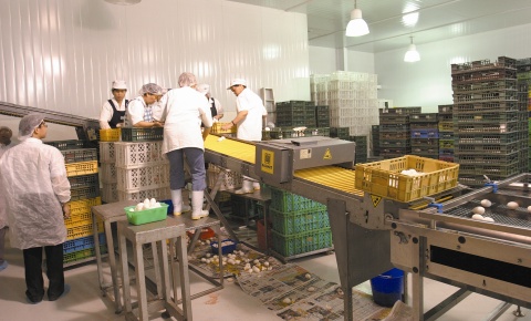 | 由雞舍的輸送帶運送出來後,先透過人工篩選,選出明顯不能使用的雞蛋,或是蛋殼過薄的雞蛋,這些雞蛋可能留做其他同業調度之用,不會印上大山雞場的標誌。 |