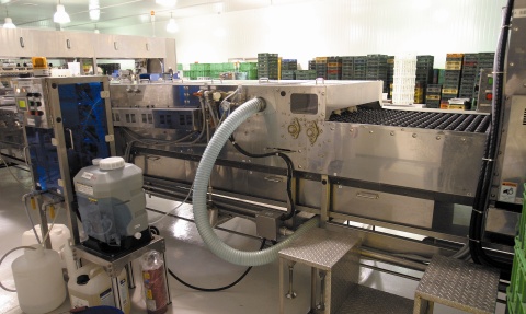 | 進入自動洗蛋的設備,洗蛋的水柱中會加入少許的消毒水,清洗蛋上的髒汙。 |
