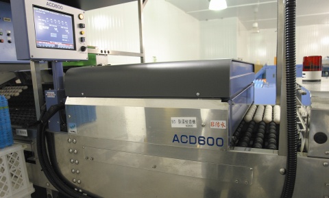 此外,在蛋經由雞舍內的輸送帶傳送到後端的自動化洗選蛋設備時,在蛋的篩選與分級上,大山雞場也運用了IT科技。蔡佩凌指出,在經過一連串的機器的自動裂蛋測試(去除蛋殼過薄的蛋)、清洗等過程,最終還必須進行蛋的分級篩選時,自動化洗選蛋設備會以一道約5,000燭光的光線照射每顆雞蛋,透過反射的波長不同,由系統判別是否為血蛋,如果為血蛋或重量不足,就會自動將其透過傳送帶傳送至不合格的區域。而僅有符合系統內設定的重量標準的雞蛋,才會送至包裝區。