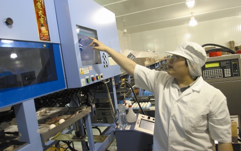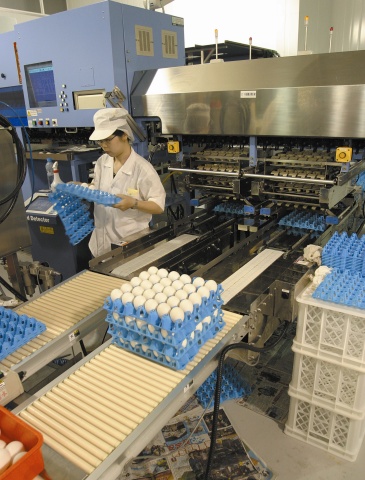 | 重量在系統設定範圍內的雞蛋,如20~25克的範圍內,將會噴上大山雞場的商標,並且依不同包裝分類,隨著輸送帶運輸到包裝區。 |