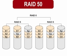 RAID 5與RAID 0的組合,先作RAID 5,再作RAID 0,也就是對多組RAID 5彼此構成Stripe存取。由於RAID 50是以RAID 5為基礎,而RAID 5至少需要3臺硬碟,因此要以多組RAID 5構成RAID 50,至少需要6臺硬碟。以RAID 50最小的6臺硬碟組態為例,先把6臺硬碟分為2組,每組3臺構成RAID 5,如此就得到兩組RAID 5,然後再把兩組RAID 5構成RAID 0。