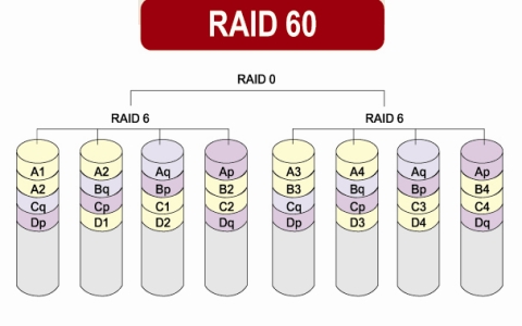 RAID 6與RAID 0的組合:先作RAID 6,再作RAID 0。換句話說,就是對兩組以上的RAID 6作Stripe存取。RAID 6至少需具備4臺硬碟,所以RAID 60的最小需求是8臺硬碟。