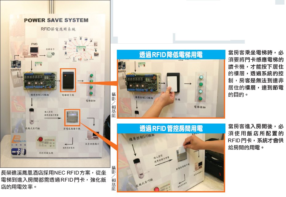 飯店業目前有透過RFID做到客房的控管,NEC推出的RFID方案則是在房客的門卡內建被動式RFID,從搭乘電梯到進入房門的鑰匙都需要這張卡片,甚至是房間的供電,都必須透過RFID的辨識,系統才會供給房間電力。預計明年完工的長榮礁溪鳳凰酒店就採用NEC此套RFID方案,來降低飯店整體用電量。