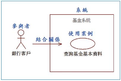 舉例來說,申辦基金帳戶使用案例的前置條件是,銀行客戶已經擁有綜合存款帳戶了。但是,綜存帳戶的資料並不是存在基金系統中,而是由另一個銀行系統負責保管的。所以,常見的做法,可能使將銀行系統列為次要參與者,如圖8所示。 可是,系統分析師可能會有如下的考慮: