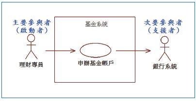 對應圖11的情況,在申辦基金帳戶的使用案例敘述中,我們可能做如下的敘述,如圖12所示。在操作流程上,我們也可以有如圖13的設計: