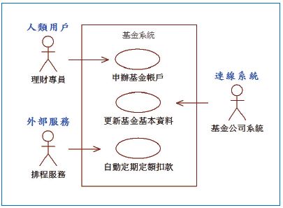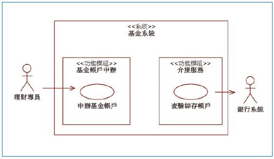 2. 再者,綜存帳戶的資料其實完全由另一個銀行系統所提供,為了將基金系統與其他系統之間的相依性侷限在一處,所以系統分析師會切分出「介接服務」的功能模組,專門用來安置委託其他系統執行的使用案例。