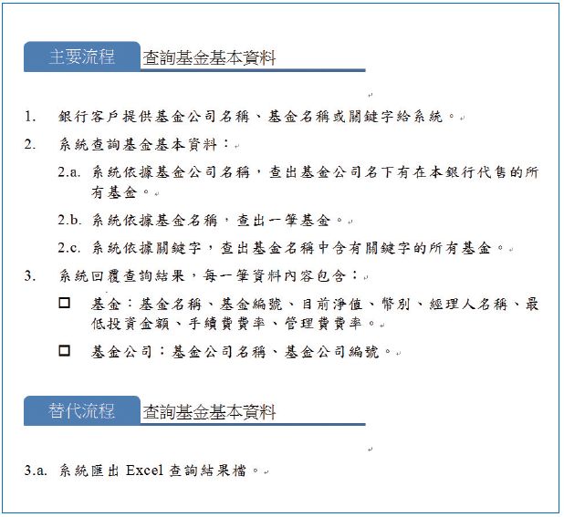 在主要流程中載明的是一般的、正常的基本流程,執行期間發生較少出現的特殊支流時,則另外記錄在替代流程中。以查詢基金基本資料為例,系統提供匯出Excel檔的附加功能,方便銀行客戶取得查詢結果作為他用。針對主要流程第3步驟,可能出現一個匯出Excel檔的支流,記錄成編號3.a的替代流程,如圖4。