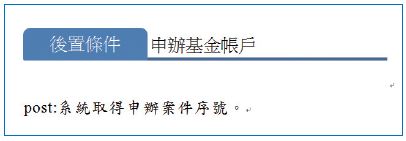 有前置條件,相對的,也有後置條件(post-condition)。前置條件做為執行使用案例前的把關,後置條件則為執行後做把關。一旦,使用案例正常執行完畢後,就應該可以通過後置條件,否則會意味著該使用案例並未正常執行完畢。同樣以申辦基金帳戶為例,後置條件可能是已經取得了申辦案件序號,如圖6。