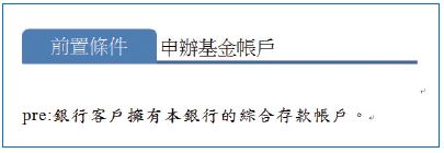 以開基金帳戶的業務流程為例,銀行會要求銀行客戶必須先擁有本銀行的綜合存款帳戶。因此,系統分析師可以把這個條件設為啟動「申辦基金帳戶」使用案例的前置條件,意味著必須通過這項前置條件,才能夠啟動這個使用案例,如圖5。