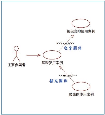 使用案例之間的主要關係有兩種,一為「包含關係」(include),另一為「擴充關係」(extend)。兩者都採用帶箭頭虛線,而且得在虛線旁邊標示出《include》或《extend》字眼,特別需要注意的是,兩者的箭頭方向恰好相反,如圖7所示。