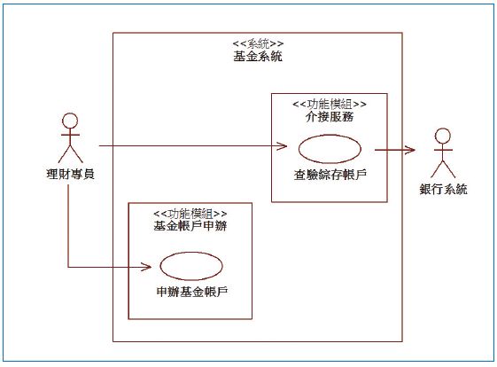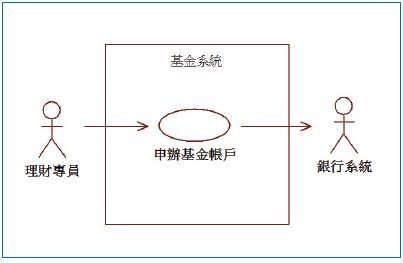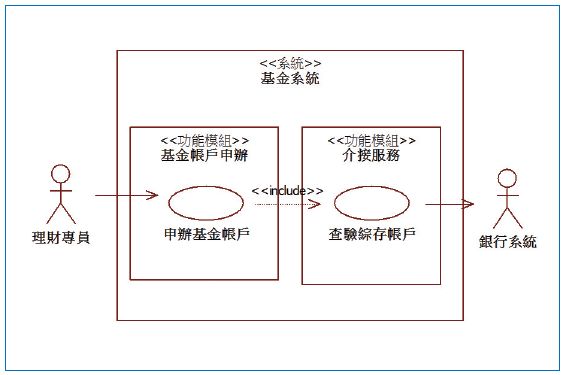 對於申辦基金帳戶使用案例而言,一定要確認綜存帳戶已經存在,才能夠被啟動,所以兩個使用案例之間就可以使用「包含關係」了,如圖10所示。