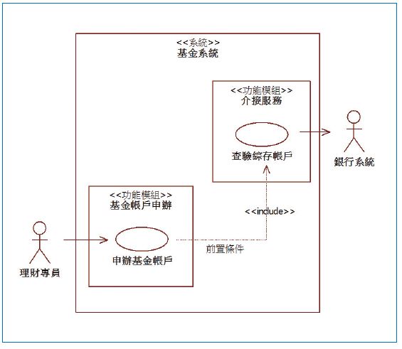 此外,系統分析師也可以在包含關係旁,特別標記出「前置條件」的字眼,意味著系統是因為要檢驗申辦基金帳戶的前置條件,才設置這條包含關係的,如圖11所示。