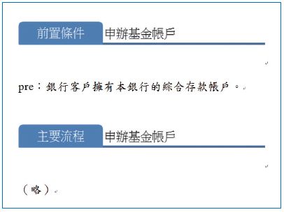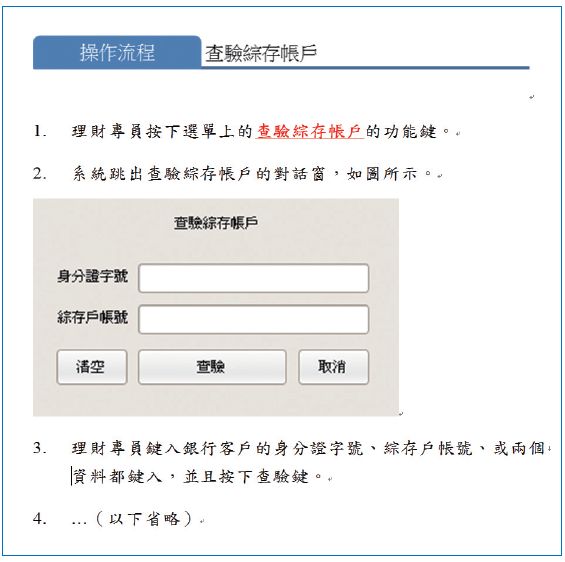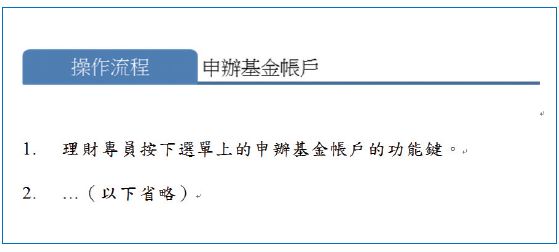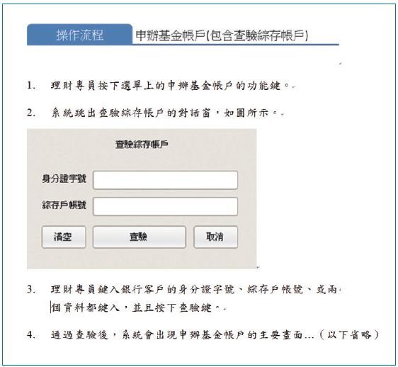 如此一來,操作流程可能也要同步修訂,得把查驗綜存帳戶跟申辦基金帳戶切開來描述,如圖15和圖16。