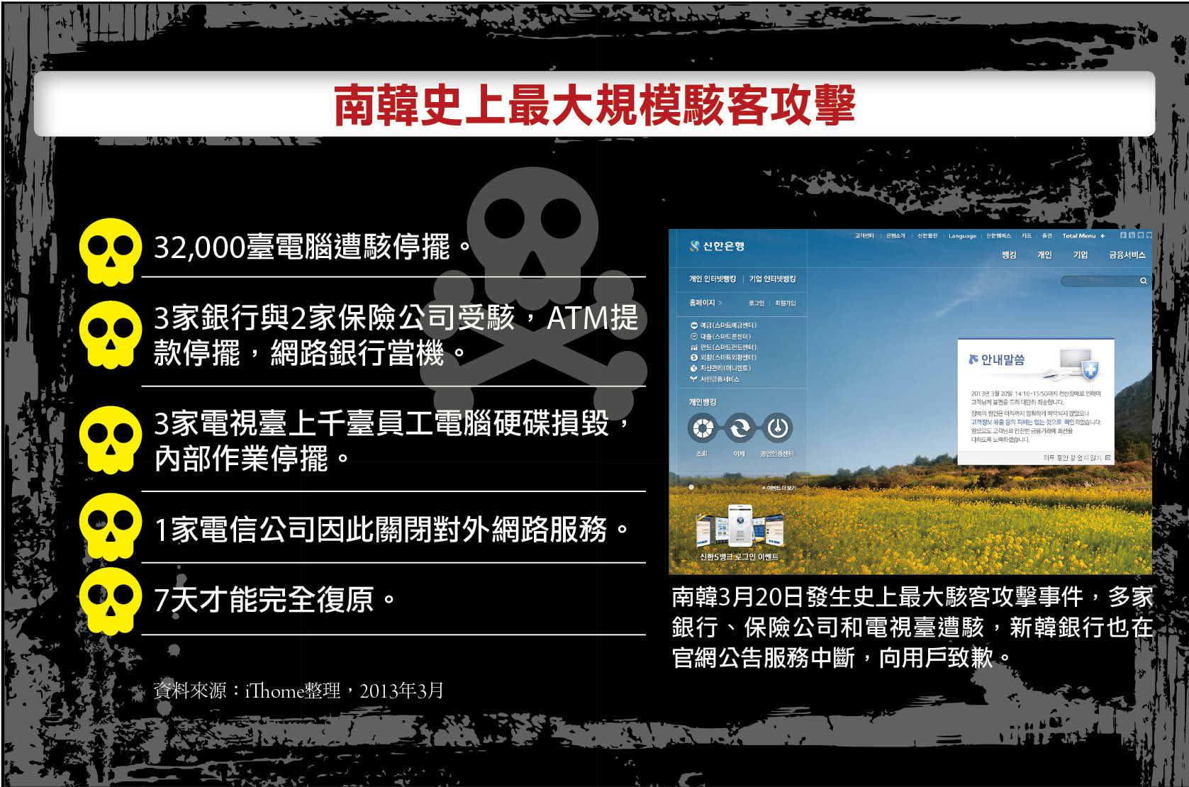 韓國3月20日發生史上最大駭客攻擊事件,防毒公司的伺服器被駭,反而開始散播內有惡意程式的軟體,感染了多家銀行、電視臺等企業內部共3萬2千臺個人電腦,在3月20日下午2點造成 大規模當機。