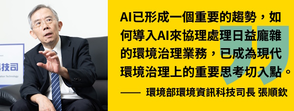 「AI已形成一個重要的趨勢,如何導入AI來協理處理日益龐雜的環境治理業務,已成為現代環境治理上的重要思考切入點,不僅是部長的期待,也是行政院推動行創新AI內閣的目標」,張順欽說。