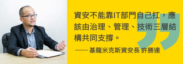 談起基龍米克斯的資安原則,許勝達直言:「資安不能靠IT部門自己扛。」在他看來,資安應該由「治理、管理、技術」三層結構共同支撐。