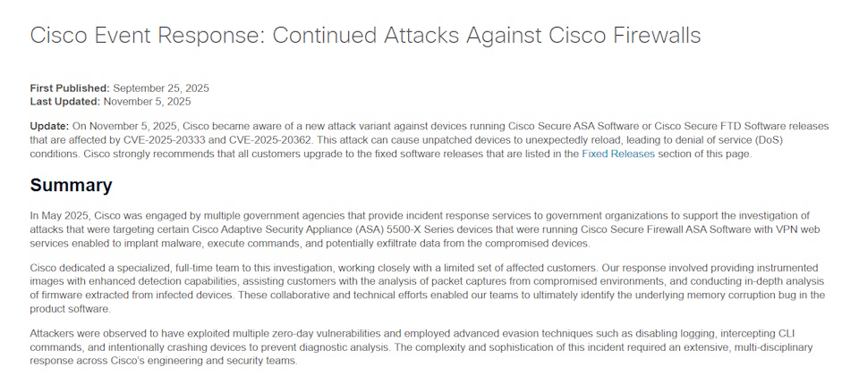 思科警告9月修補的防火牆漏洞CVE-2025-20333 及 CVE-2025-20362再發現新一波攻擊,影響特定款Cisco ASA 5500-X Series裝置