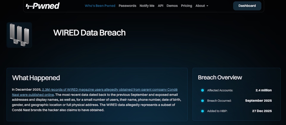 Bleeping Computer報導,駭客聲稱入侵媒體集團康泰納仕(Condé Nast),並且公開旗下雜誌Wired包含230萬筆訂戶記錄的資料庫