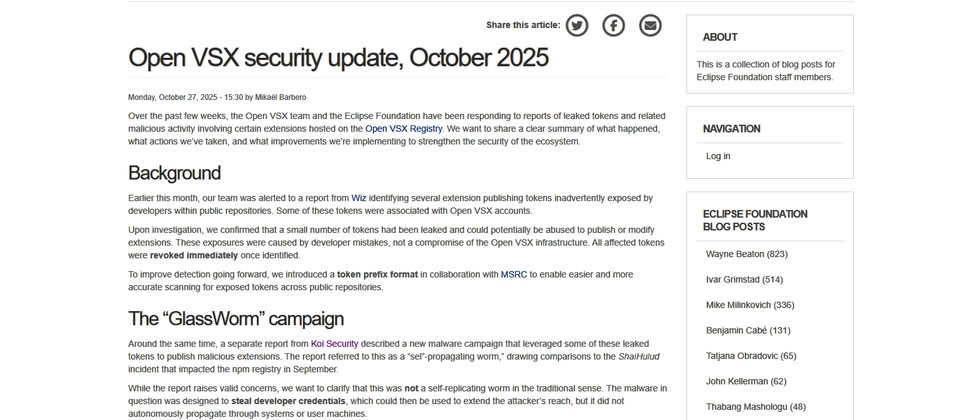 經營Open VSX的Eclipse基金會近日公布蠕蟲GlassWorm資安事故的調查結果,指出攻擊者濫用的權杖,源自今年2月開發人員在Visual Studio Code(VS Code)延伸套件不慎曝露的機敏資料