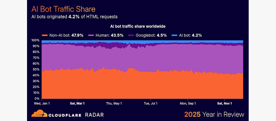 根據CDN與資安服務業者Cloudflare調查,2025年網路流量中,Googlebot以及各種AI Bot流量已經接近9%