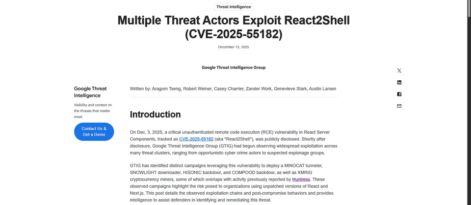 引起全球資安圈高度關注的重大漏洞CVE-2025-55182(React2Shell),Google威脅情報團隊(GTIG)週末揭露最新調查結果,指出有5組中國國家級駭客用於散布隧道工具、惡意程式下載工具,以及後門程式等作案工具