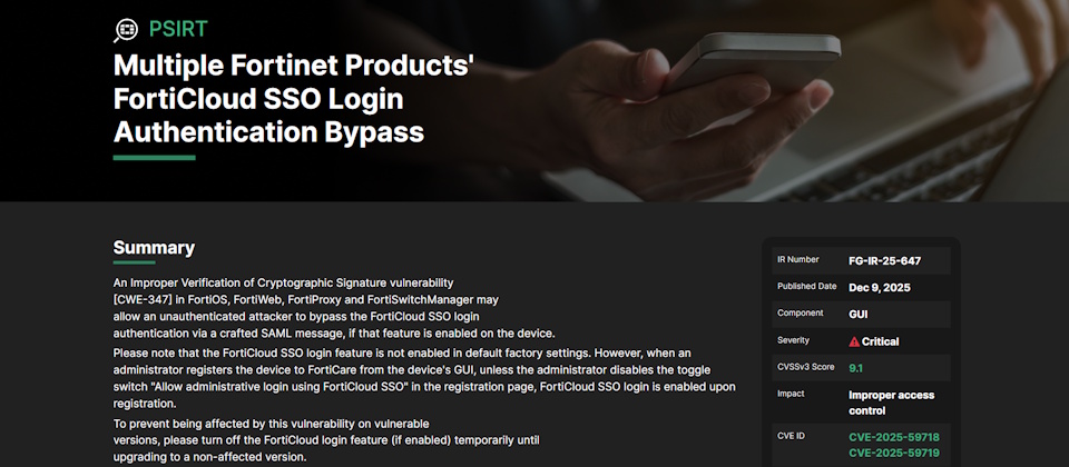 在Fortinet修補兩項產品重大漏洞CVE-2025-59718及CVE-2025-59719的兩天後,資安業者開始觀察到FortiGate裝置出現惡意單一簽入登入的跡象