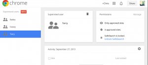 這項功能讓家長可以監控小孩的上網行為,除了可以看到小孩的網站瀏覽歷史之外,也可以設定可以上那些網站、不可以上那些網站,設定為阻欄的網站也可做存取權限管理。另外還可以將Google搜尋的「安全搜尋」功能鎖定,讓小孩不能自行關閉。