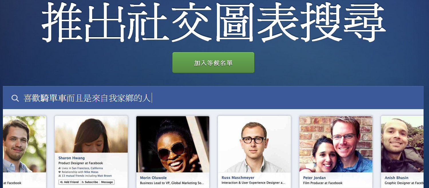 這項社交搜尋務和一般搜尋不同,所搜尋的是來自使用者社交圈的資訊,涵蓋友人的檔案、被標註的照片、所居住的城市、曾按讚的內容,或曾打卡的地點等。未來幾周使用美式英語版本的Facebook用戶將可開始使用。