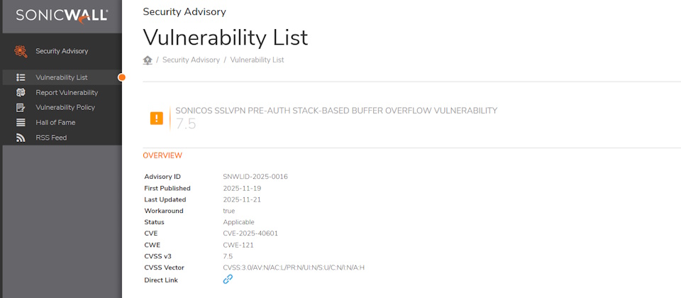 新聞 SonicWALL, 防火牆, CVE-2025-40601