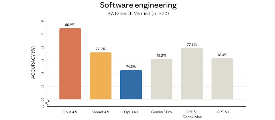 Claude Opus 4.5成為首個在SWE-Bench Verified突破80%的模型,顯示其程式碼修正能力已逼近甚至超越專業水準