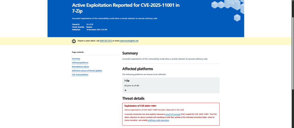 本週英國警告,今年7月7-Zip修補的資安漏洞CVE-2025-11001,近期出現遭到利用的跡象,他們呼籲用戶應儘速套用更新程式因應