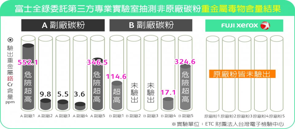 依據富士全錄印表機維修中心統計,造成機器故障的最大原因是使用「非原廠耗材(即俗稱相容/環保碳粉匣)」,固定使用原廠耗材的機器故障率明顯較低,且依第三方專業實驗室抽測市售非原廠碳粉發現,非原廠耗材多數含有重金屬毒物「鉻」,並在列印時容易產生大量粉塵飄散於空氣中,對使用者健康及周邊環境都有極大危害。富士全錄印表機台灣區總經理王珮祥表示:「台灣消費者購買非原廠耗材的原因,常是為節省成本,或對劣質碳粉的危害不了解,這正是黑心商品猖獗的主因。為了打擊黑心商品,富士全錄印表機希望能拋磚引玉,由我們自行吸收成本來降低消費者的整體使用支出,包括提供『粉有禮耗材積點』供兌換免費碳粉匣或禮券,並積極宣導耗材選購知識,這次更希望透過提供全系列產品三年保固,來鼓勵大家選購對機器效能及環境、健康都有保障的原廠耗材。」