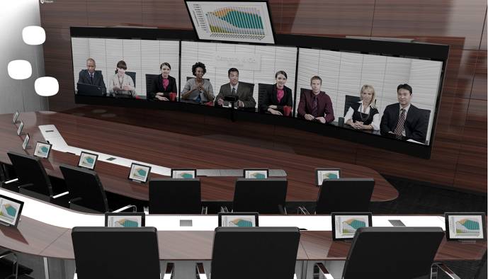 Polycom RealPresence lmmersive Studio搭配沉浸式的會議室佈局,為處在不同地域的與會者營造傳統的圓桌會議氛圍 |