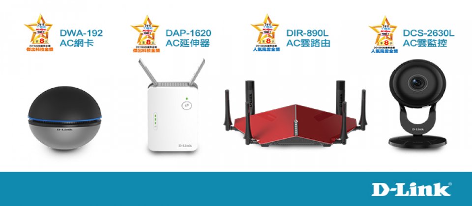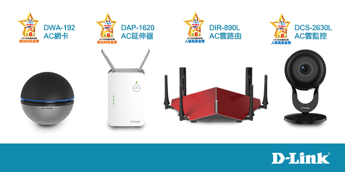 [台北訊,01062015] – 第八屆「科技趨勢金獎」名單昨日(5日)下午正式揭曉,網通領導品牌D-Link友訊科技不負眾望,四款802.11ac競速指標產品一舉拿下四項大獎,成為網通業界入圍最多、獲獎也最多的網通品牌。友訊分別以全球首款AC1900 USB無線網卡DWA-192及AC1200無線延伸器DAP-1620勇奪網路暨雲端設備類別傑出科技獎;而PC Magazine網通類年度最佳產品AC3200旗艦機皇DIR-890L及全球首推免旋轉180°超廣角高畫質AC家用無線網路攝影機DCS-2630L則獲頒網路暨雲端設備類別人氣風雲獎殊榮。