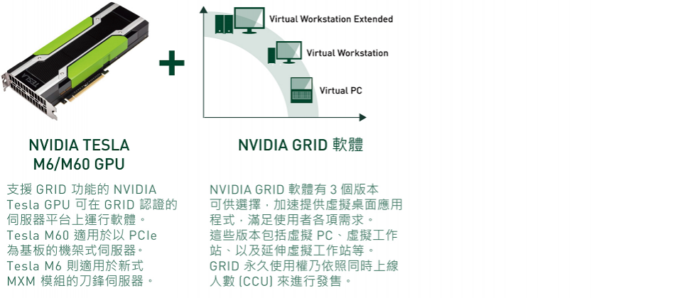 目前各式雲端創新應用,資料中心的系統漸趨多樣化且複雜,不僅需要同時兼具即時運算與巨量資料分析的需求,更要符合綠色節能的時代趨勢,除 GPU 運算同時擁有效能與節能上的優勢外,對於相容性的要求也極具重要,因此 GRID 2.0 在硬體設計上除了支援機架式伺服器外,其中更包括最新刀鋒型伺服器的支援,讓更多種類的伺服器都能利用 GRID 驅動虛擬桌面。而軟體支援上對 Linux 的新增支援更是讓繪圖加速虛擬化的優勢不再僅局限於 Windows 作業系統內,讓虛擬化應用充滿更多樣性的發展潛能。