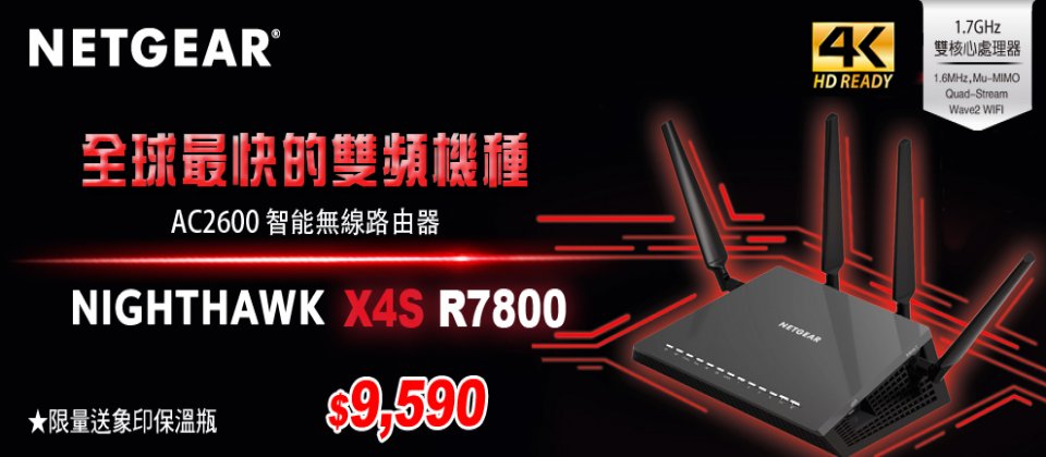 NETGEAR推出全新Wi-Fi機種-夜鷹X4S R7800 無線智能路由器,是目前全球速度最快的雙頻路由器,支援最新的160MHz無線頻寬技術,讓行動設備也能順暢的播放線上4K影像串流,是智慧家庭必備的無線影音中心。