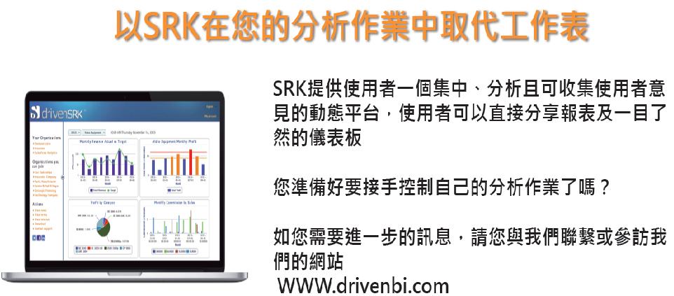 SRK從一開始就是為一般使用者(Business users)為設計宗旨,不需要像傳統智慧商業平台先建立數據倉儲及ETL,中都汽車百貨股份有限公司把工作表分析轉移集中到SRK平台上。公司的報表製作專員在短短的二個月內即可上手, SRK是一個雲端架構平台,使用報表分析沒有時間與地域的限制,不需購買任何硬體,不用擔心軟體維護的問題。報表即時分析,做準確決策,能開拓更多業務。