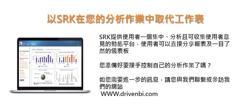 SRK從一開始就是為一般使用者(Business users)為設計宗旨,不需要像傳統智慧商業平台先建立數據倉儲及ETL,中都汽車百貨股份有限公司把工作表分析轉移集中到SRK平台上。公司的報表製作專員在短短的二個月內即可上手, SRK是一個雲端架構平台,使用報表分析沒有時間與地域的限制,不需購買任何硬體,不用擔心軟體維護的問題。報表即時分析,做準確決策,能開拓更多業務。