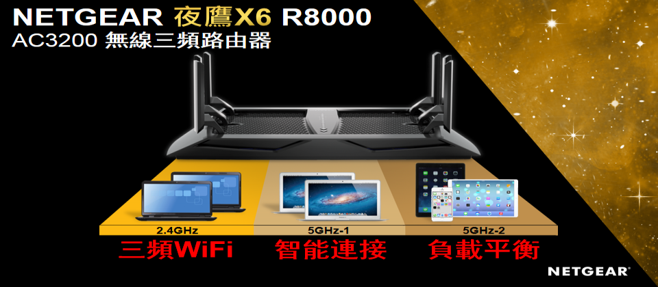 NETGEAR本屆獲獎的「夜鷹X6 AC3200無線三頻路由器-R8000」提供高達3.2Gbps的WiFi極速與3個獨立的WiFi頻段(一個2.4GHz+兩個5GHz),主機內建1GHz雙核心處理器與256MB記憶體等強悍硬體規格。R8000最特別的地方在於「智能連接」功能,可自動判斷連線設備的無線速率,再分配至合適的WiFi頻段,達到速度分流的效果,將頻寬的運用最佳化,就算家庭內所有的網路設備都同時進行下載、視訊串流、或是線上遊戲,也不會感到網路降速或是延遲卡頓。R8000的6支高性能天線也提供了大範圍的訊號覆蓋率,讓家中每個角落都能享受WiFi的便利,是大型住家、透天厝或是中小型辦公室的最佳選擇。