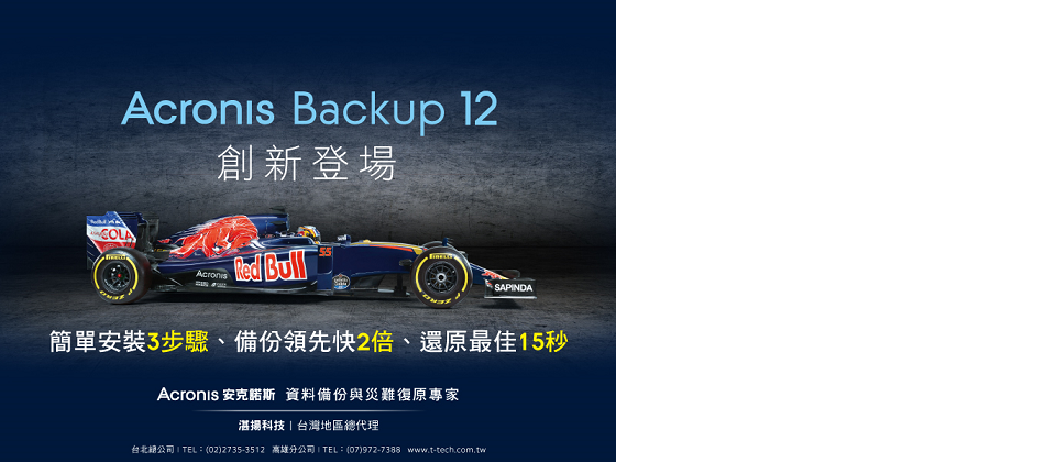 安克諾斯Acronis宣布顛覆性的解決方案『Acronis Backup 12高級標準版』創新上市。隨著目前大多數企業資產數位化,不限於存放單一裝置或位置,企業需要一款支援此新興經營方式的完整備份解決方案。Acronis Backup 12滿足企業所需,具有現今混合雲端IT環境下備份及保護公司資料的能力,無論資料在雲端、內部部署、跨虛擬和實體系統、遠端位置系統,皆可完全掌握。同時具備快速安裝簡單3步驟、領先同業備份快2倍、還原時間最佳15秒,領先全球的顛覆性備份還原解決方案創新登場。