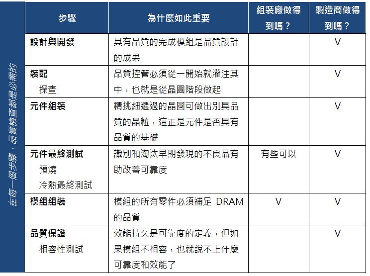 模組組裝:記憶體不是只是元件那麼簡單 – 其他零件必須能夠補足 DRAM 的品質。經過使用高速自動化取放機器和自動化迴焊爐的 8 步驟程序後,元件組裝至優質印刷電路板 (PCB) 並成為完成模組。模組完成組裝後,接著必須通過熱模組測試以驗證其組裝正確。