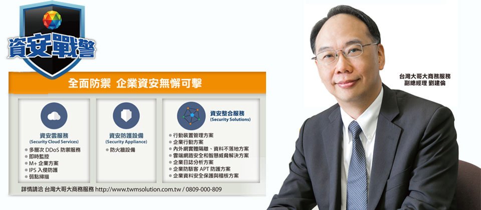 台灣大哥大商務服務副總經理劉建倫說明,台灣會成為駭客組織眼中主要攻擊目標之一,除因身為全球高科技製造業重鎮,有許多高價值的商業能量,更看上台灣具備基礎網路健全的特性。如此一來,當駭客順利在企業內部植入惡意程式後,即可快速感染其他各種連網設備,建構數量龐大的殭屍電腦,日後便能針對特定網站發動大流量的DDoS攻擊。為此,台灣大哥大特別攜手安碁科技、Arbor推出全新「資安戰警」服務, 提供企業用戶一次購足並快速導入專業的資安防禦服務與設備,對抗無所不在的資安威脅。