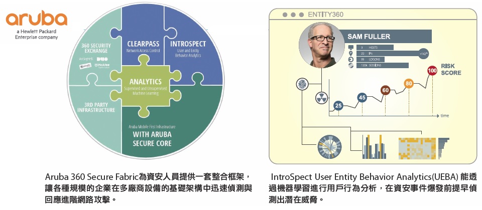 整合三大元件的Aruba 360 Secure Fabric,融合多種防護機制的安全框架,可提供設備認證、使用者行為分析與監控的功能,搭配Aruba 360 Security Exchange計畫,能夠提供企業更完整的安全防護機制,保護終端裝置安全並大幅降低資料外洩的風險。